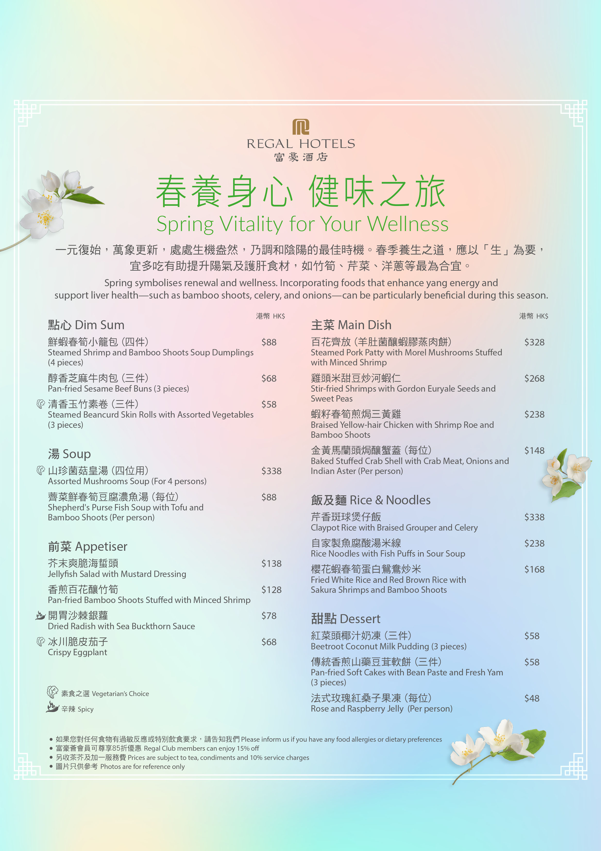 The “Spring Vitality for Your Wellness” menu is available at the designated Chinese restaurants of Regal Hotels from now until 4 May 2025. Regal Club members can enjoy a 15% discount*.