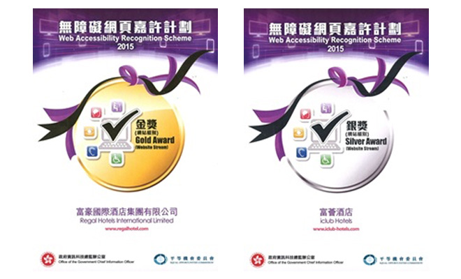 富豪國際酒店集團 (www.regalhotel.com) 於政府資訊科技總監辦公室及平等機會委員會合辦的「第三屆無障礙網頁嘉許計劃」中,獲頒殊榮。富豪及旗下之富薈酒店分別獲得金獎及銀獎,以表揚集團網站有效採用無障礙設計,方便有特別需要人士使用。