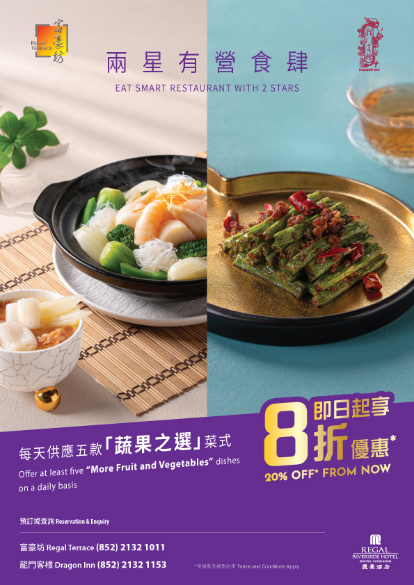 富豪坊及龍門客棧有幸獲選為兩星有營食肆,現每天供應共5款指定「蔬果之選」菜式,更享8折優惠,有「營」盡在麗豪。